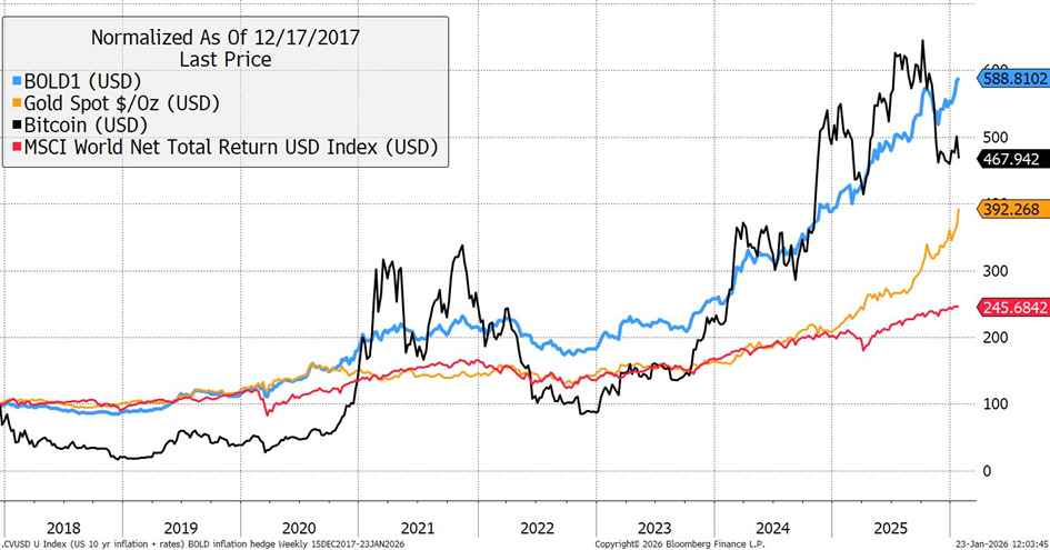 He also adds that Bitcoin and Gold work together as highlighted in the below chart displaying Bitcoin vs Gold vs ETP BOLD vs MSCI World as of the 17th of December 2017: