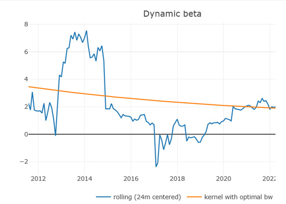 As an illustration, the beta of Bitcoin relative to the NASDAQ is around 2 over the period and even recently:
