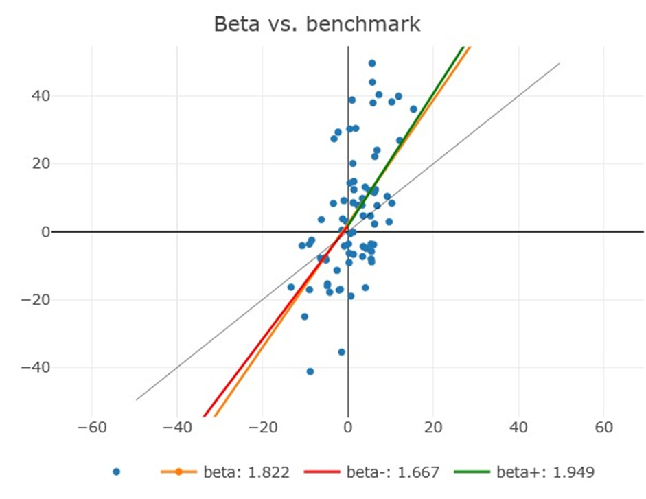 Sure, correlation is low (0.18) but given the volatility ratio, we get a beta of 1.82 since 2020 versus NASDAQ: