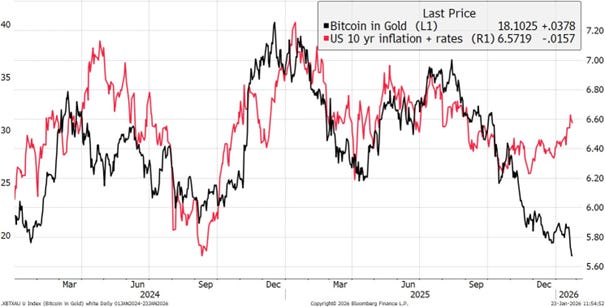 “A year ago, one bitcoin bought 40 ounces of gold. Today that has fallen to 18. One feature of this relationship is linked to bonds. By combining 10-year Treasury yields and 10 yr inflation expectations, there has often been a good fit, but that has recently broken as gold is on a tear, and Bitcoin has been weak.”